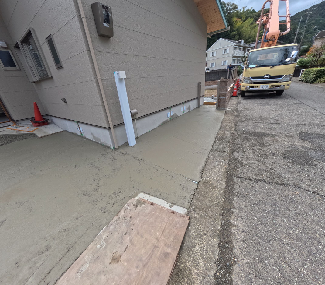 玄関前カーポートなど、家の周りのコンクリート打設工事が完了しました。